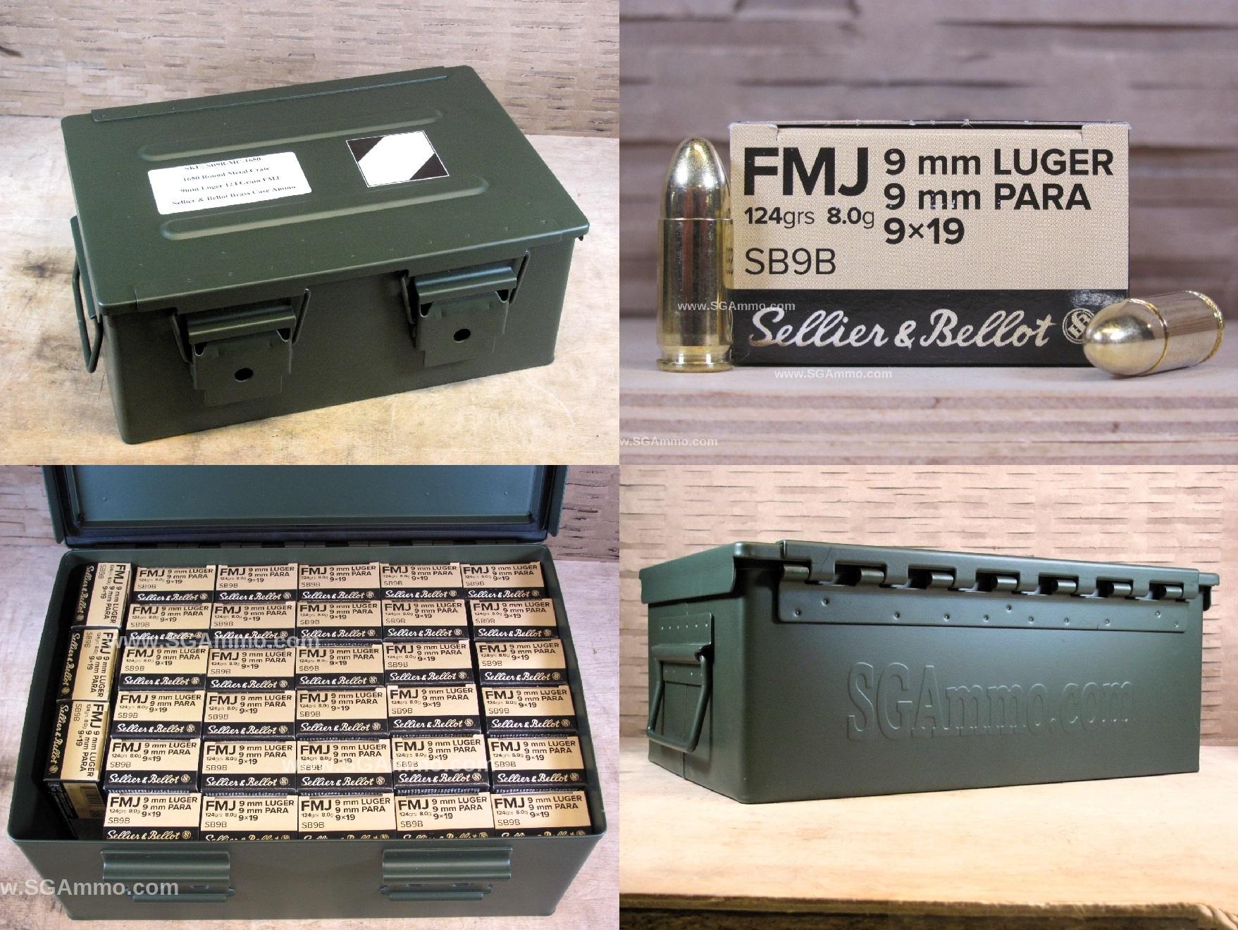 1650 Round Metal Crate Canister - 9mm Luger 124 Grain FMJ Sellier Bellot Ammo - SB9B