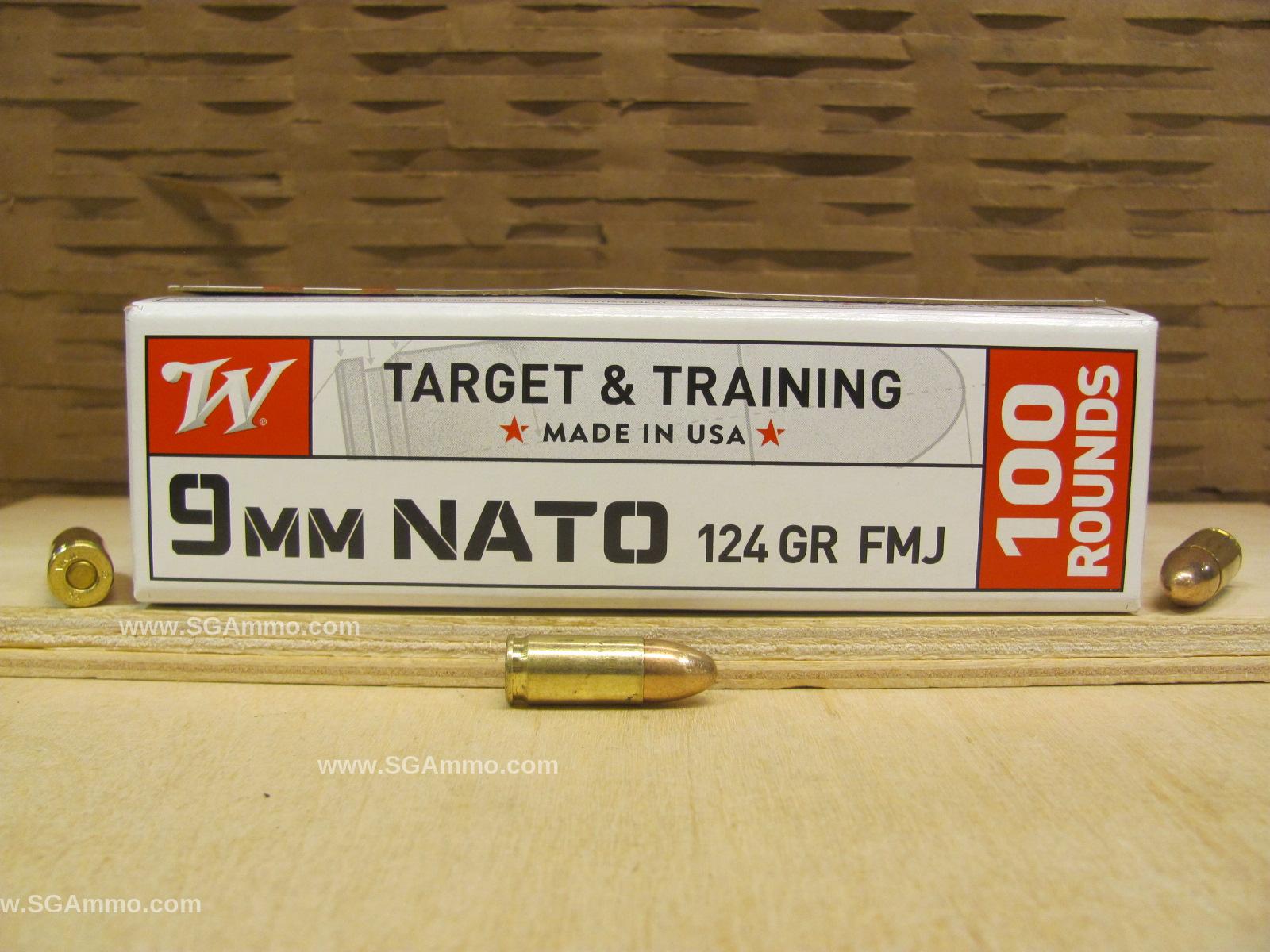 100 Round Box - 9mm NATO 124 Grain FMJ Winchester Target and Training Ammo - W9NATOVP