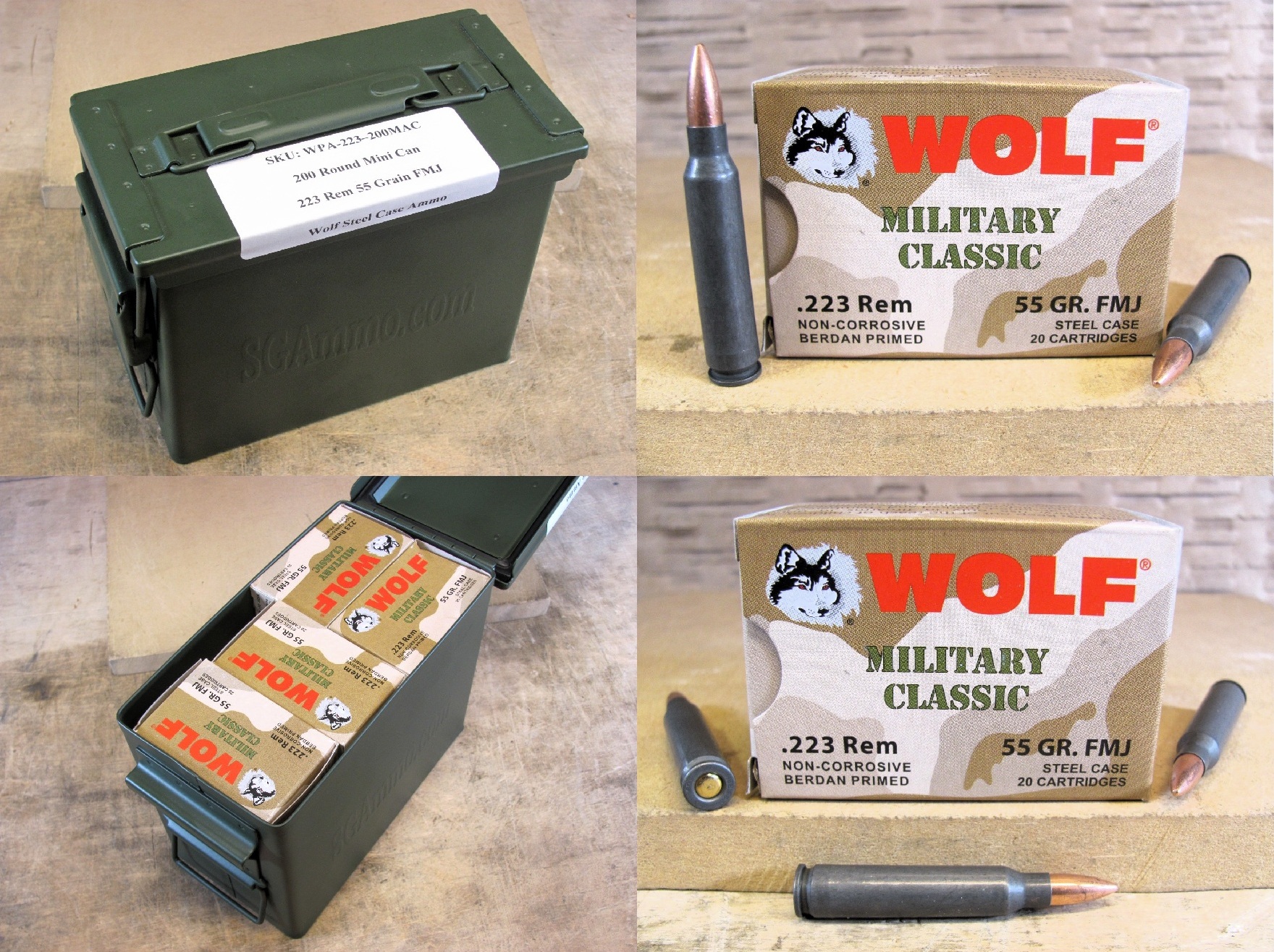 200 Round Can - 223 Rem 55 Grain FMJ Wolf Military Classic Steel Case Ammo made by Barnaul - Packed in Mini Canister