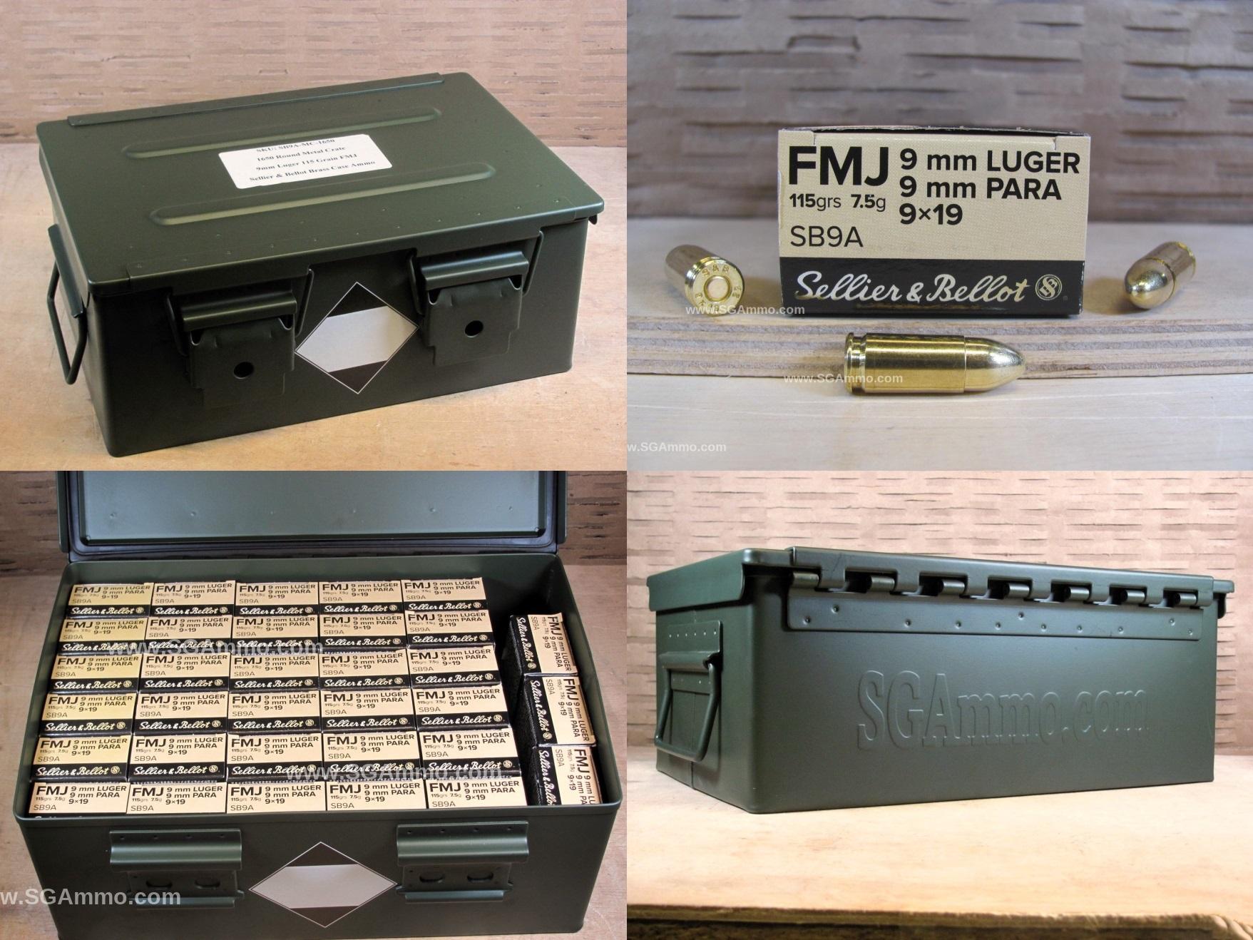 1650 Round Metal Crate Canister - 9mm Luger Sellier Bellot 115 Grain FMJ Brass Case Ammo - SB9A