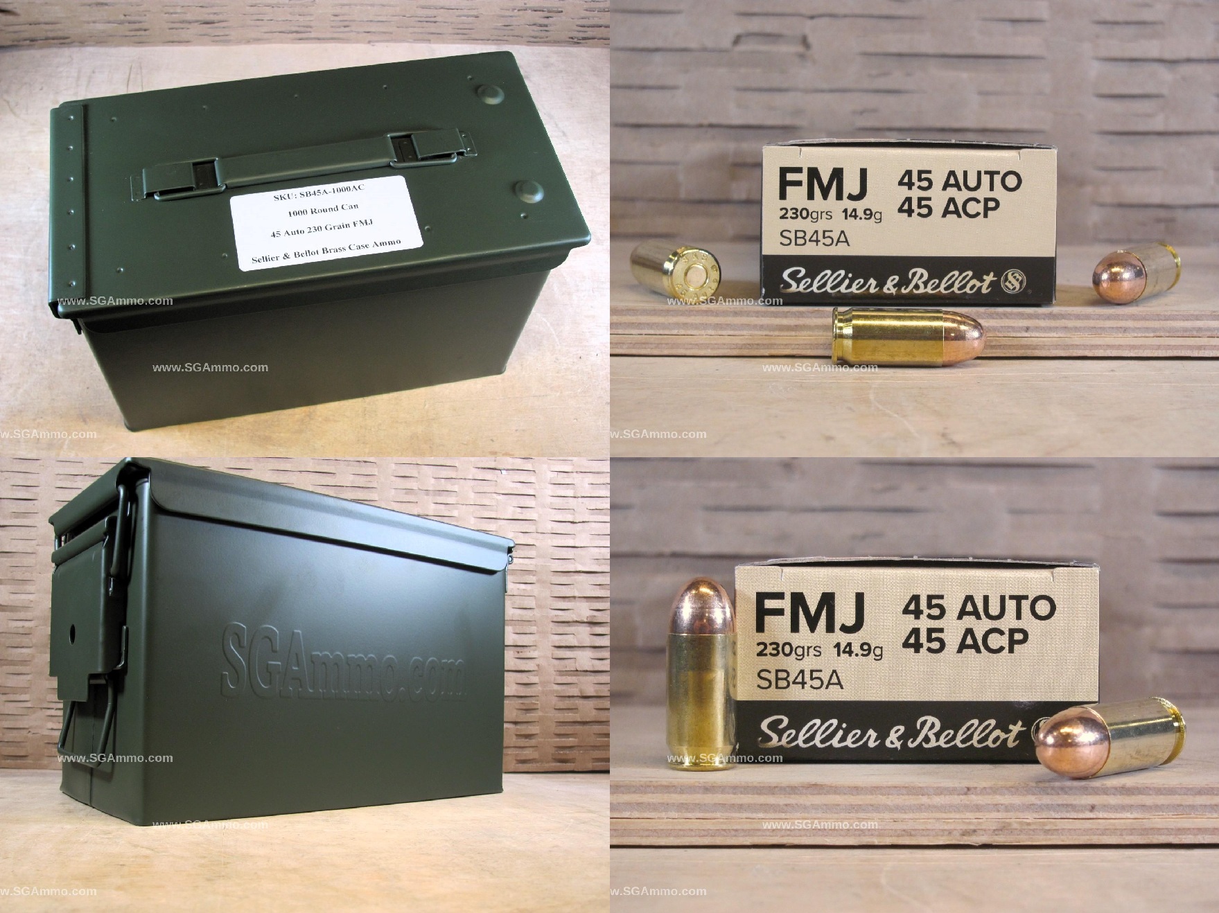1000 Round Case - 45 Auto 230 Grain FMJ Sellier Bellot Brass Case Ammo - SB45A