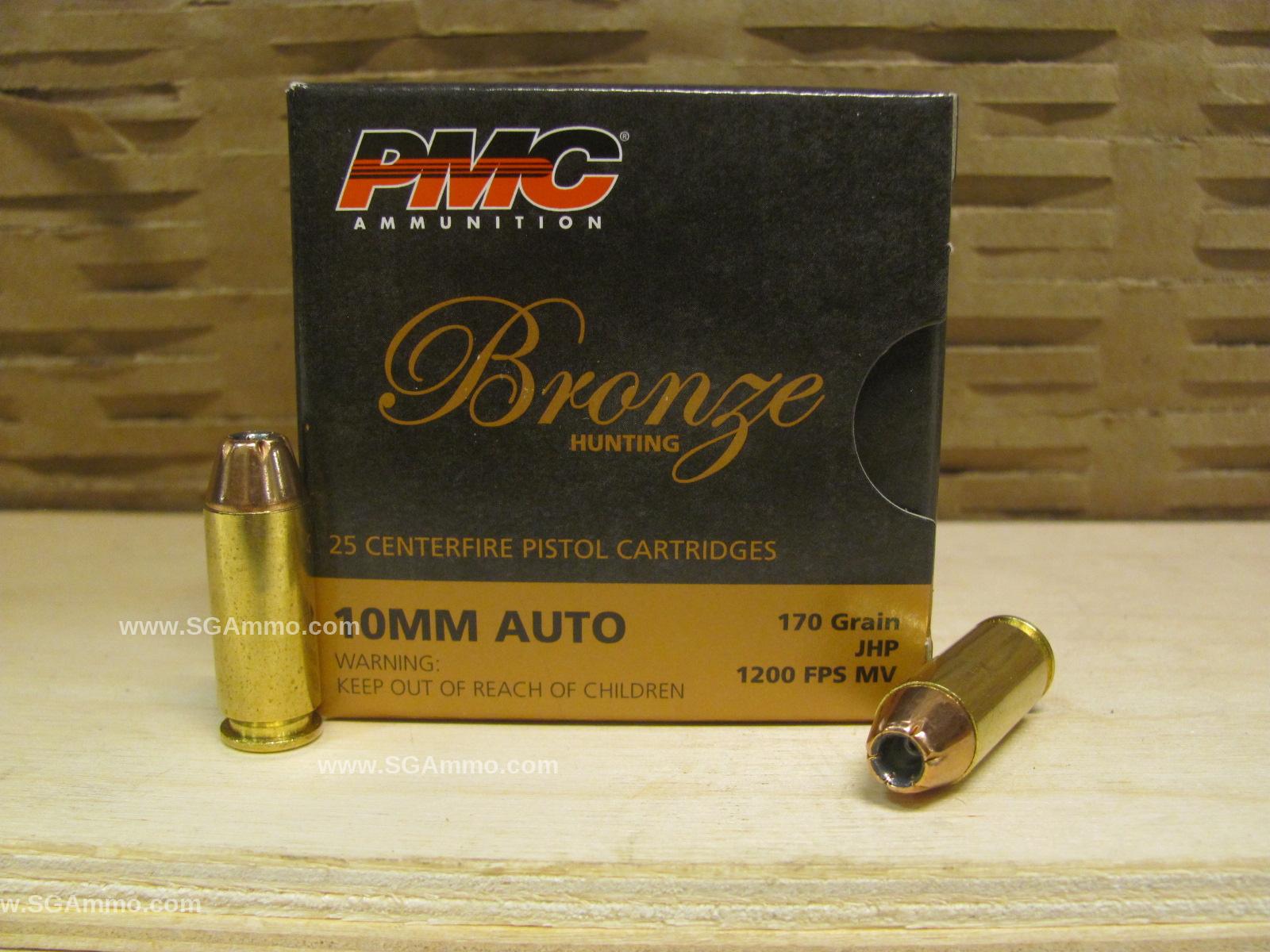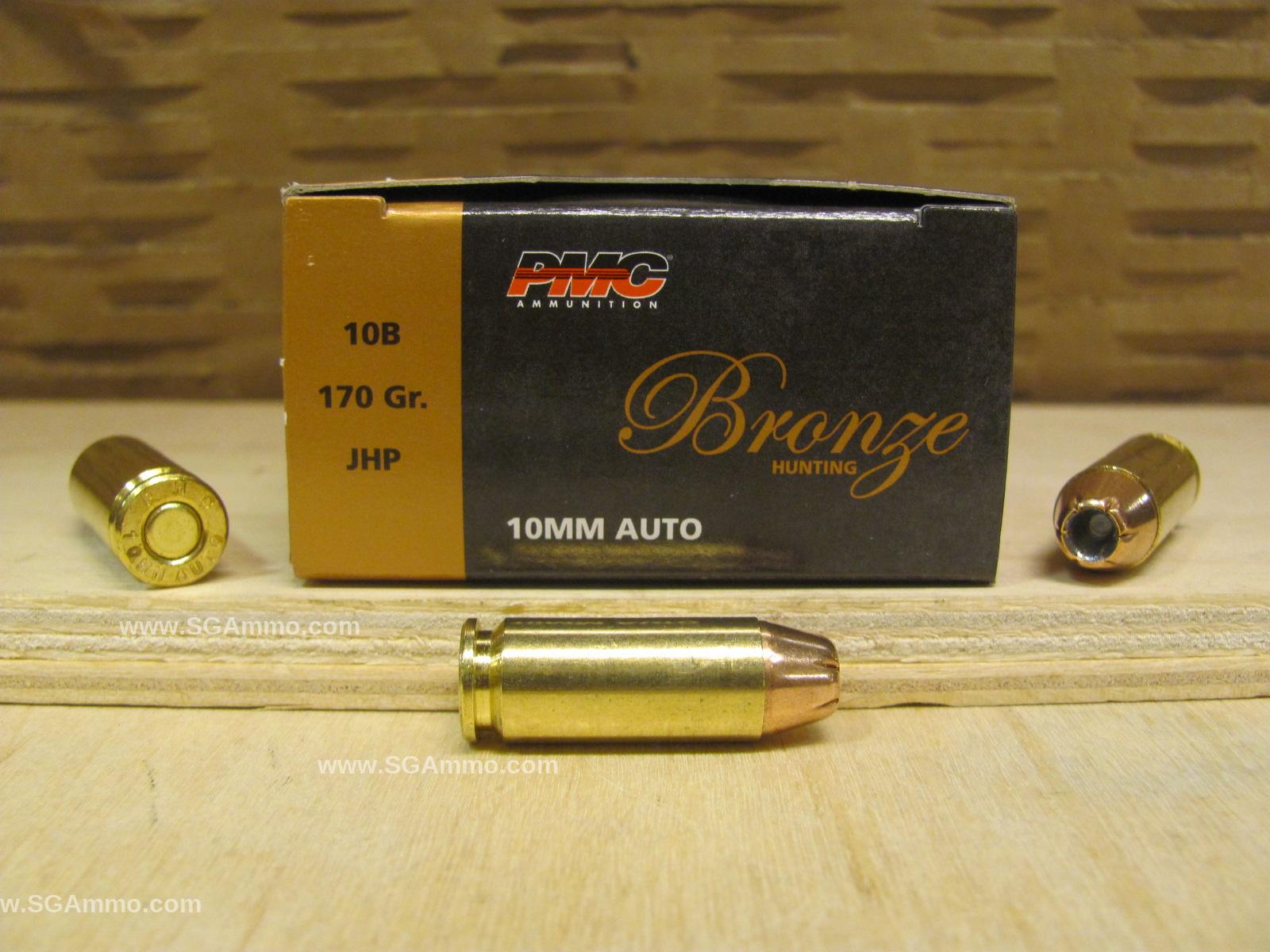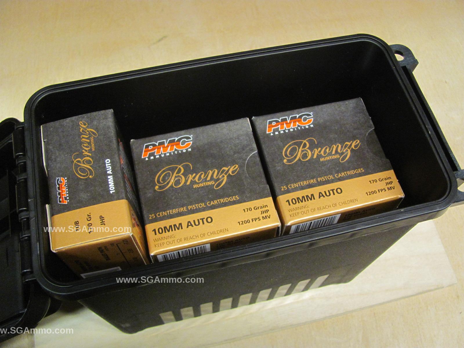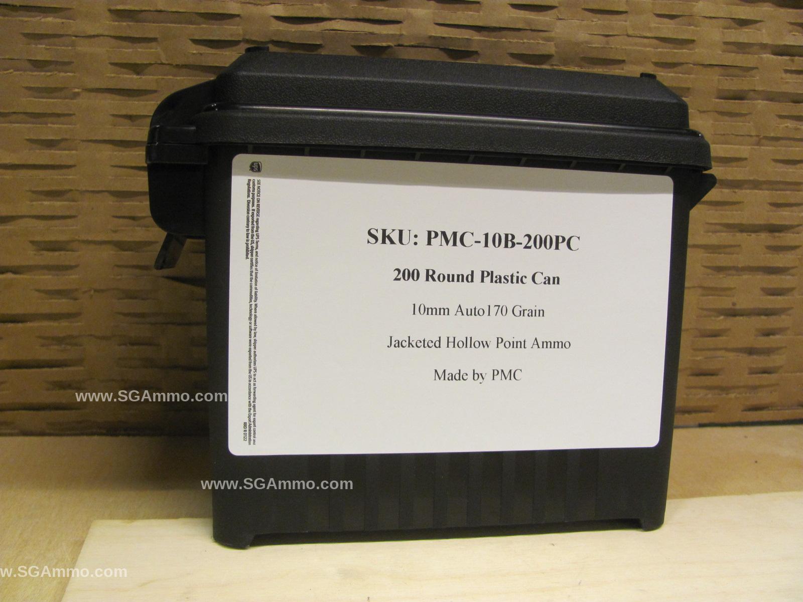 200 Round Plastic Can of 10mm Auto 170 Grain Jacketed Hollow Point Ammo by PMC Packed in Small Plastic Canister SKU # 10B For sale online at SGAmmo.com. This ammo comes 25 rounds per box, 8 boxes per plastic can. Brass case, boxer primer, non-corrosive hollow point ammo for personal protection, hunting or target practice. PMC ammo offers you the consumer high quality ammunition at affordable prices.