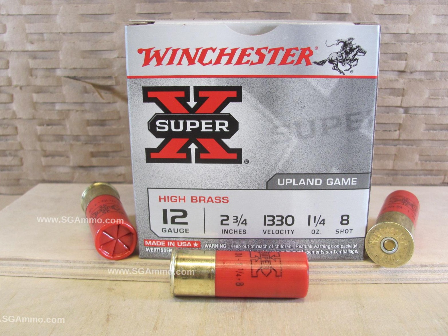 250 Round Case of 12 Gauge 2.75 Inch 1.25 Ounce Number 8 Shot Winchester Super X High Brass Ammo For Sale SKU # X128 Velocity: 1330 FPS Upland and Small Game Load