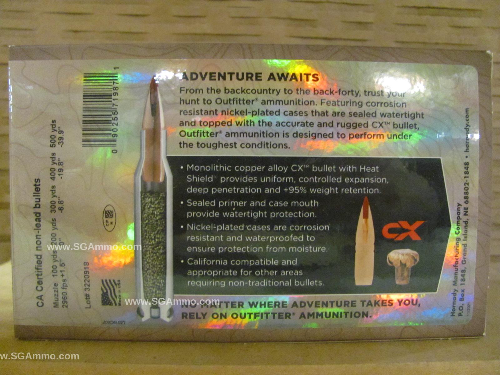 From the backcountry to the back-forty, trust your hunt to Outfitter ammunition. Featuring corrosion resistant nickel-plated cases that are sealed watertight and topped with the accurate and rugged CX bullet, Outfitter ammunition is designed to perform under the toughest conditions.