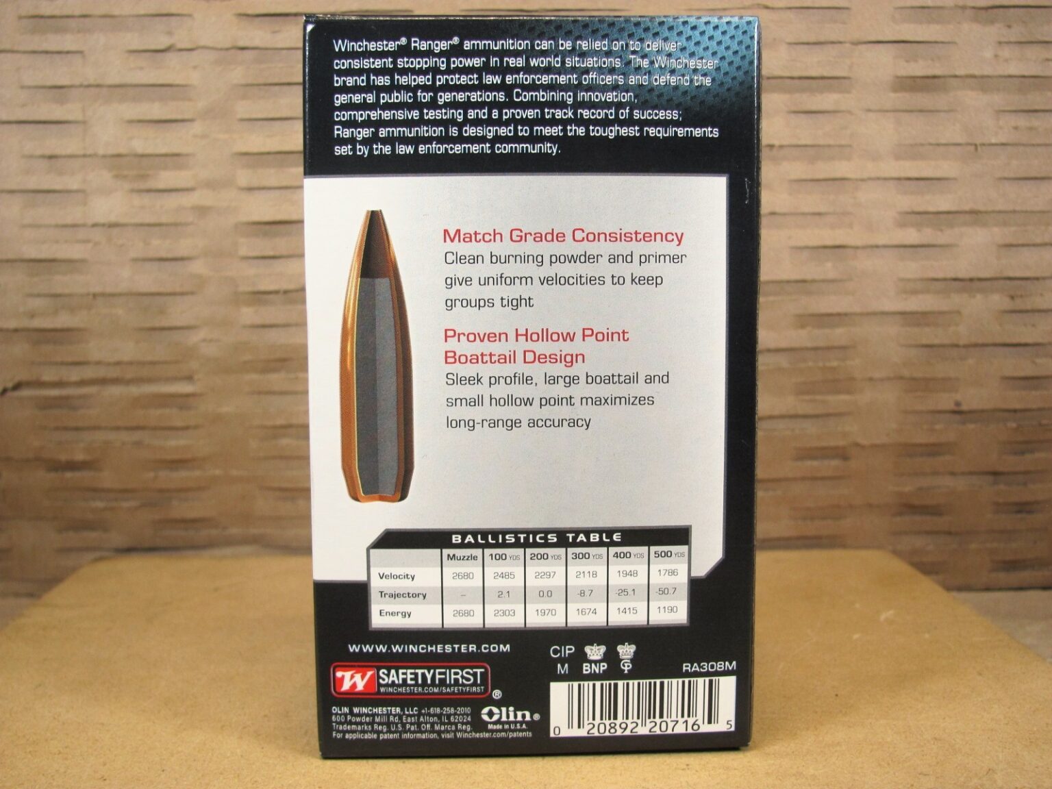 20 Round Box of 308 Win 168 Grain Hollow Point BT Winchester Ranger Match Ammo For Sale RA308