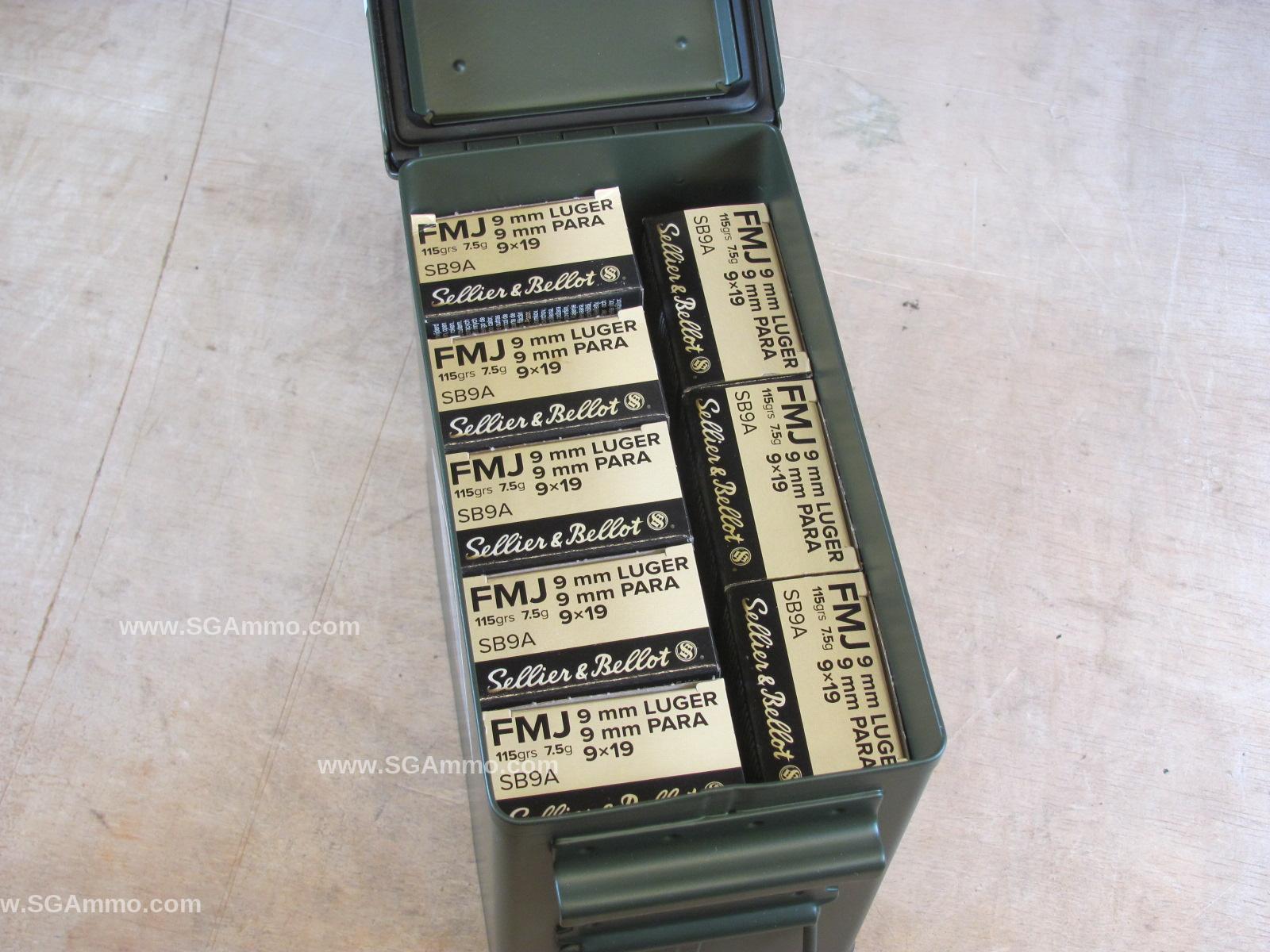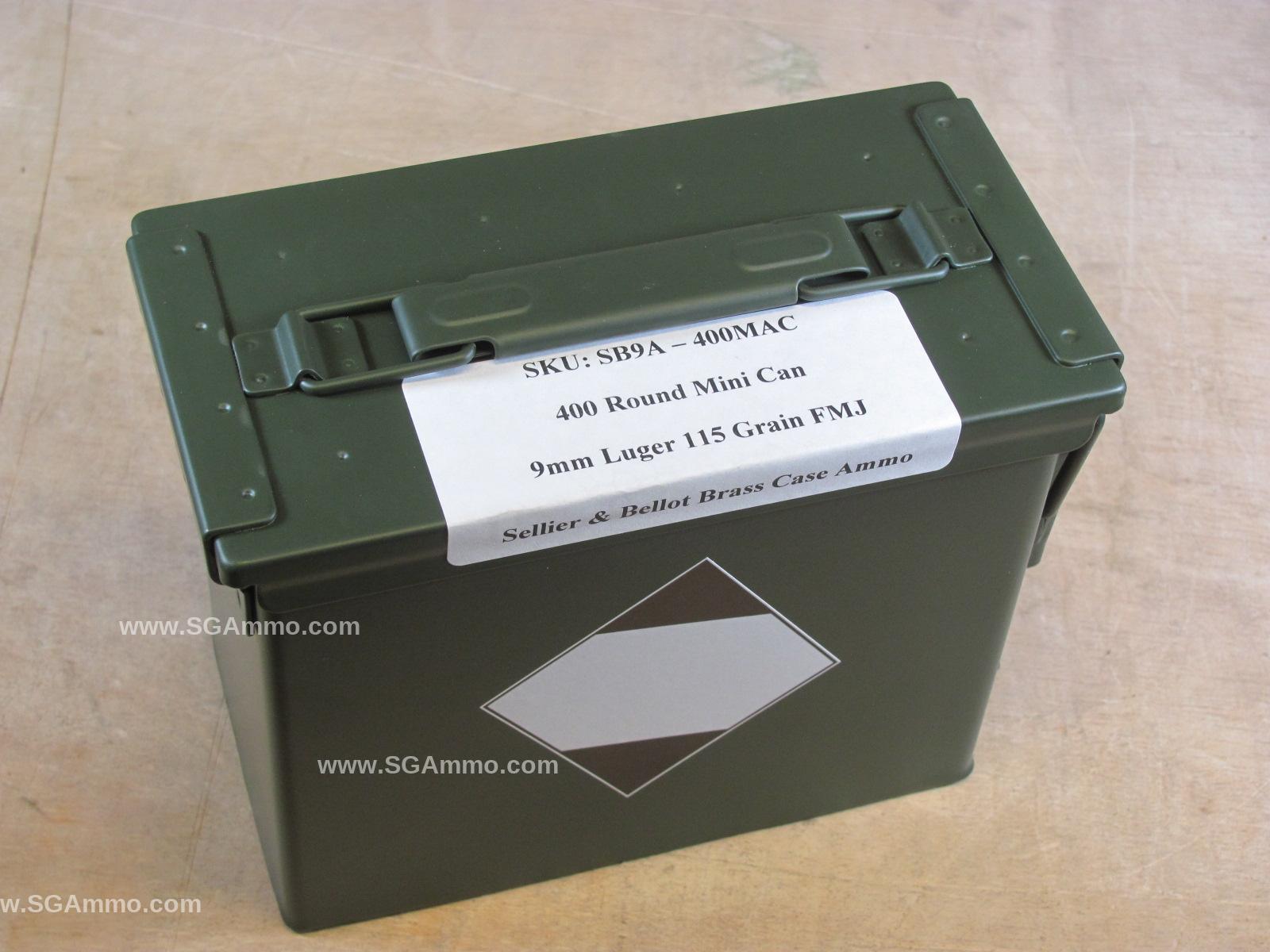 400 Round Can – 9mm Luger Sellier Bellot 115 Grain FMJ Brass Case Ammo – SB9A – Packed in Mini Ammo Canister